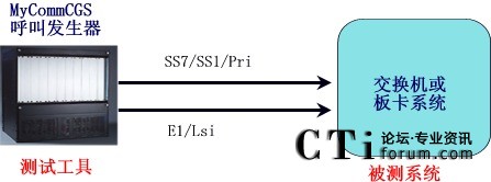 直接將MyCommCGS呼叫發(fā)生器與被測(cè)系統(tǒng)對(duì)接直連,連接電纜可以采用數(shù)字中繼或者模擬線路,信令支持中國(guó)7號(hào)、中國(guó)1號(hào)或者ISDN