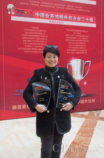 在2012中國(guó)服務(wù)外包領(lǐng)軍者年會(huì)的頒獎(jiǎng)典禮上,第一線集團(tuán)華北區(qū)總經(jīng)理陳施慧女士上臺(tái)領(lǐng)取了這兩個(gè)獎(jiǎng)項(xiàng)。