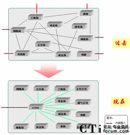 “12345” 政府熱線系統(tǒng)建設(shè)的最終目標(biāo),將要整合現(xiàn)有的全部政府部門公開電話資源,將所有的此類電話統(tǒng)一為一個(gè)號(hào),使政府公開電話服務(wù)范圍覆蓋到政府公共服務(wù)的全部領(lǐng)域。通過12345電話網(wǎng)絡(luò)將各級機(jī)構(gòu)服務(wù)電話資源進(jìn)行互聯(lián)(市區(qū)縣政府、公安非應(yīng)急電話、社保局、民政局、建設(shè)局、規(guī)劃局、國稅局、地稅局、教育局、衛(wèi)生局、文體局、旅游局、交通局、房產(chǎn)局等),這樣市民就不用再被這些部門上百個(gè)不同的電話號(hào)碼弄得無所適從,也不會(huì)因?yàn)榕磺宄虑闅w哪個(gè)部門管了。