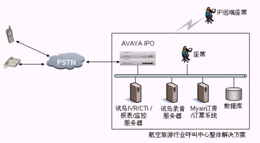 本方案采用Avaya IP office系列交換機(jī),通過訊鳥中間件控制整個(gè)呼叫中心的電話呼入、呼出。它支持多種聯(lián)絡(luò)渠道,包括語音、交互式自動(dòng)語音應(yīng)答(IVR)、傳真、電子郵件、web、短消息等,同時(shí)利用Myair航空管理系統(tǒng)來完成整個(gè)業(yè)務(wù)流程,廣泛適用于航空旅游服務(wù)公司訂房、訂票呼叫中心的業(yè)務(wù)需求。
