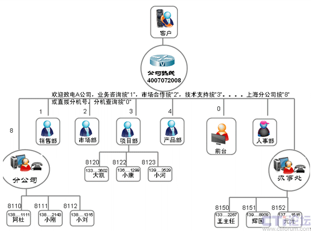 一直以來(lái),呼叫中心座席的形式比較固定,大都通過(guò)長(zhǎng)期坐在辦公室的人員使用PC機(jī)和電話機(jī)結(jié)合的方式進(jìn)行工作。但是,這種形式顯然不能滿(mǎn)足中小企業(yè)運(yùn)營(yíng)管理的需要,在以銷(xiāo)售為重的中小企業(yè)中大部分人員并不完全坐在辦公室工作,如客戶(hù)經(jīng)理、客戶(hù)服務(wù)工程師,即使坐在辦公室,也不會(huì)一直在等著接電話,如開(kāi)發(fā)工程師、生產(chǎn)車(chē)間的人員等等。如何既要滿(mǎn)足企業(yè)運(yùn)營(yíng)的需要,又要實(shí)現(xiàn)呼叫的管理和分配呢?我們只需要將座席的形式簡(jiǎn)化,將呼叫分配的目標(biāo)擴(kuò)大就可以了。手機(jī)是目前最常見(jiàn)和普遍的通信工具,只要我們將手機(jī)做為座席進(jìn)行管理,既不改變現(xiàn)有的組織架構(gòu),又能充分利用呼叫分配工作并對(duì)工作人員進(jìn)行管理,這將大大提高中小企業(yè)運(yùn)營(yíng)管理的靈活性和變通性。企業(yè)組織架構(gòu)如下: