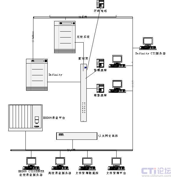 - 設(shè)計(jì)采用一臺(tái)中繼端全程記錄HXD09交換機(jī),一臺(tái)HXD09交換機(jī)CTI服務(wù)器,一臺(tái)離線錄音服務(wù)器,一臺(tái)數(shù)據(jù)庫服務(wù)器。