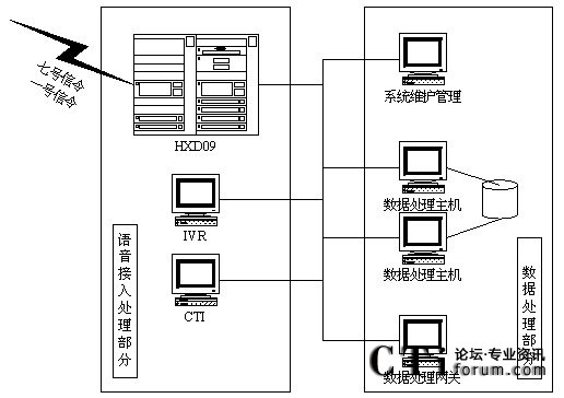語音接入處理部分主要完成用戶的語音話路接入功能。其中:HXD09語音交換機(jī)可以支持七號信令和一號信令的數(shù)字E1線路的接入。HXD09的IVR完成自動業(yè)務(wù)受理功能,實現(xiàn)系統(tǒng)7*24小時不間斷服務(wù)。CTI完成對排隊機(jī)的監(jiān)視、控制任務(wù),并能夠?qū)崟r的提供每個語音通道的信息配合IVR完成自動繳費業(yè)務(wù)的實現(xiàn)。