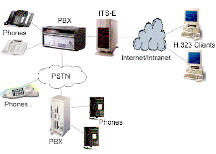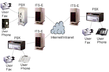 許多公司有多個(gè)辦公地點(diǎn),各地之間有著頻繁的通訊往來(lái),電話和傳真。典型地,通訊涉及到公用交換電話網(wǎng)(PSTN)或PBX間的私人連接路線。Internet電話服務(wù)器(ITS-E)提供了另一選擇;驹硎且惶幱脩魮艽虻碾娫捊(jīng)本地PBX路由到本地ITS-E,本地ITS-E通過(guò)IP網(wǎng)絡(luò)送到目的地ITS-E,目的地ITS-E再將電話送到目的地PBX上,最后送到目的地電話或傳真機(jī)上。