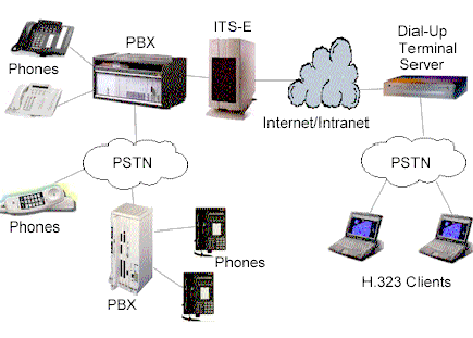 計(jì)算機(jī)IP電話產(chǎn)品,類似網(wǎng)絡(luò)會(huì)議系統(tǒng),允許用戶使用他們當(dāng)前的IP聯(lián)接把通話接到電腦上去(如通過(guò)以太網(wǎng)聯(lián)接到他們的局域網(wǎng)中)。這種作法的局限是PC用戶只可以與另一PC用戶通話。然而,使用ITS-E,這種局限將不存在。任何在網(wǎng)絡(luò)上的PC可使用H.323(用于IP電話上的ITU-T標(biāo)準(zhǔn))軟件包來(lái)實(shí)現(xiàn)通話,如微軟的網(wǎng)絡(luò)會(huì)議系統(tǒng),通過(guò)ITS-E服務(wù)器通至一個(gè)常規(guī)的電話使用者。電話用戶不需要任何新的裝備,甚至不會(huì)意識(shí)到聲音是從PC機(jī)中傳出及在IP網(wǎng)絡(luò)中傳輸。示意圖如下: