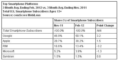 按截至今年2月份的三個(gè)月的平均數(shù)計(jì)算,美國(guó)智能手機(jī)用戶數(shù)超過1.04億人,相比截止去年11月的三個(gè)月的平均數(shù)增長(zhǎng)14%。谷歌Android操作系統(tǒng)在美國(guó)手機(jī)市場(chǎng)的份額超過50%,相比去年同期上升了17個(gè)百分點(diǎn);蘋果iOS操作系統(tǒng)排名第二,其市場(chǎng)份額為30.2%(與去年同期相比上升了5個(gè)百分點(diǎn));其后依次是RIM黑莓操作系統(tǒng)的13.4%,微軟Windows