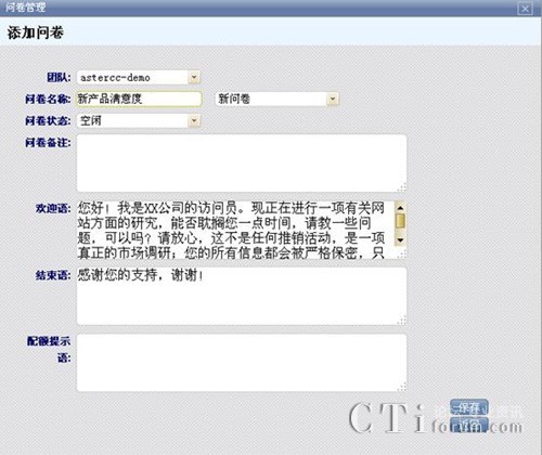 添加功能用來(lái)添加新問(wèn)卷,這里你可以根據(jù)業(yè)務(wù)的需要設(shè)定所需要得信息,例如問(wèn)卷的歡迎語(yǔ),結(jié)束語(yǔ),配額提示語(yǔ)等信息,自定義輸入信息。