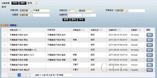 利用搜索功能,輸入搜索條件然后查詢,列表中便會(huì)出現(xiàn)質(zhì)檢的問(wèn)卷結(jié)果。以及問(wèn)卷中每一個(gè)問(wèn)題出現(xiàn)所選擇的答案,供質(zhì)檢人員檢測(cè)、監(jiān)督問(wèn)卷的真實(shí)可靠性。