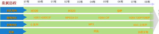 多媒體會(huì)議主要提供語音、視頻、數(shù)據(jù)的融合會(huì)議解決方案。傳統(tǒng)的多媒體會(huì)議在2001年前主要是專線(E1/ISDN)H.320的視頻會(huì)議系統(tǒng)。隨著寬帶(LAN/ADSL)的發(fā)展,2002年至2007年主要是H.323的視頻會(huì)議系統(tǒng),同時(shí)兼容H.320的專線視頻會(huì)議系統(tǒng)。2007年前音頻的主要是8k采樣的G.7xx協(xié)議,2007年后寬頻語音AAC-LD已經(jīng)普遍使用。視頻2007年前主要是4CIF格式以下的標(biāo)清系統(tǒng),2007年后H264