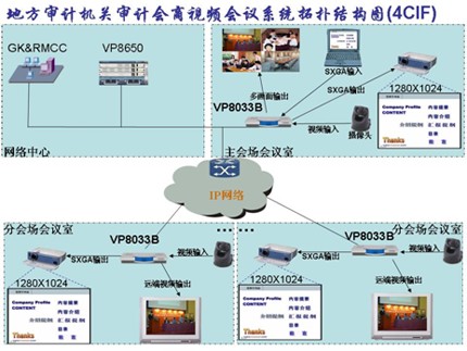 本系統(tǒng)在審計署機(jī)房配置網(wǎng)絡(luò)控制中心GK、多點資源管理系統(tǒng)和ViewPoint 8660 MCU設(shè)備。多點資源管理中心實現(xiàn)對MCU、電視會議和全網(wǎng)資源的統(tǒng)一調(diào)度,GK實現(xiàn)對IP終端入會時鑒權(quán)認(rèn)證,在主會場會議室架設(shè)一臺ViewPoint 8033B分體式視訊終端。在各分會場會議室架設(shè)一臺ViewPoint 8033B分體式視訊終端;在所有會場各架設(shè)一臺標(biāo)清攝像機(jī)、一個麥克風(fēng)、一臺高清電視或一臺高清投影機(jī)。