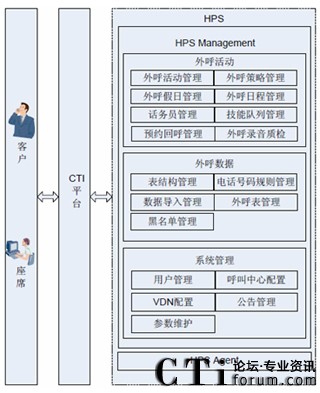 Server)提取HPS Management中導入的客戶數(shù)據(jù),自動批量的執(zhí)行外呼任務。客戶呼通后,簽入HPS Agent 的話務員為客戶提供語音服務。