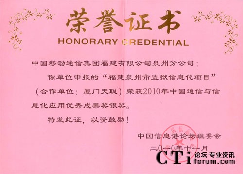 5.榮獲“2010年中國通信與信息化應(yīng)用優(yōu)秀成果獎(jiǎng)”銀獎(jiǎng)。