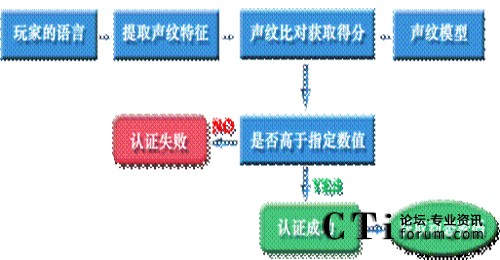 聲紋認(rèn)證是用戶通過電話至服務(wù)器端,服務(wù)器根據(jù)用戶注冊的聲紋來識別,通過認(rèn)證則為合法用戶,否則為非法用戶。認(rèn)證成功后,服務(wù)器端給予用戶一組動態(tài)數(shù)字,再結(jié)合靜態(tài)密碼,這樣可大幅提高用戶在網(wǎng)絡(luò)游戲中的安全性。(如下圖)