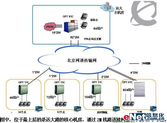 新的網(wǎng)絡建成以遠大路中心機房為核心的星形網(wǎng)絡,租用北京網(wǎng)通2M專線的方式同各個門市店連接。各個門市店設立了自己的程控交換機,并通過E1中繼方式和核心機房實現(xiàn)全網(wǎng)互聯(lián)。在此方案中,所有的市話呼入和呼出都通過核心節(jié)點同網(wǎng)通之間的中繼通道,從而實現(xiàn)大中電器內部話音通訊的統(tǒng)一編號方案、統(tǒng)一撥號規(guī)則、統(tǒng)一維護和管理;并對外公布公開和便于記憶的號碼,以配合網(wǎng)點的促銷活動,以及未來客戶服務等應用的擴展。
