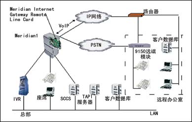 采用北電網(wǎng)絡(luò)的RemoteOffice解決方案。對于主叫用戶,與原來的撥號方案完全一樣;對于話務員座席,只是將交換機的數(shù)字座席通過廣域網(wǎng)或者專線方式連到遠端。該方案在呼叫中心的PBX上安裝北電的Meridian