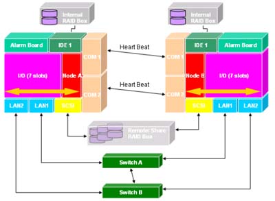 在網(wǎng)絡(luò)方面,上圖的兩臺(tái)CompactPCI系統(tǒng)各有兩個(gè)LAN,分別可透過(guò)Switch經(jīng)由防火墻連接到外部網(wǎng)絡(luò)。兩個(gè)Switch之間有網(wǎng)絡(luò)連通,且每個(gè)系統(tǒng)至少有兩個(gè)LAN可維持系統(tǒng)的網(wǎng)絡(luò)通暢。
