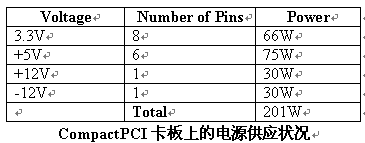 CompactPCI卡板透過J1/J2的連接器來接收電源。有8個3.3V、6個5V、1個+12V、1個-12V的電源接腳。這些接腳供應(yīng)1安培 IEC61076-4-101規(guī)格的電。每個接腳一安培的限制是保守的,而且某種程度上會誤導(dǎo)讓人以為所有的接腳可以在周邊溫度70°C的狀況下去接一安培的電流。在現(xiàn)實狀況中并不是所有連接器中的接腳都負載到最大的電流量,事實上大部分的CompactPCI接腳都是負載在以毫安為單位的電流范圍中。70°C一安培的限制,是基于流過接腳的電流所產(chǎn)生的熱。當電流增加時,也加大了跨過接腳的電位差。產(chǎn)生的熱是一種電壓和電流的函數(shù),電壓和電流的增加會使連接器接腳的溫度上升。在CompactPCI中有最顯著電流量的的接腳,是電源供應(yīng)器接腳。如果設(shè)計者假設(shè)J1/J2連接器中的其它所有接腳都有電流負載,每一個接腳的最大電流則會是在40°C 2.5Amps, 這個信息可以在IEC61076-4-101的規(guī)格中的4.2.3中被找到。在每個接腳2.5安培的條件下,板卡可取得的功率大小如下表所示,此表顯示出卡板的設(shè)計者最多可以從J1/J2連接器中拉出200Watts的電。