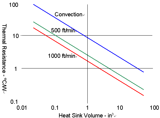 從圖上可以看出散熱片的散熱能力并不和風速成一線性函數(shù),在熱阻上一個非常顯著的改善,會在稍呈對流狀態(tài)的空氣與每分鐘500英尺的風速情況下顯現(xiàn)出來,但是從每分鐘500英尺增加到每分鐘1000英尺的風速時,熱阻的改善就沒那么顯著了。另一個用吹風方式的限制因素是噪音,當吹過卡板與散熱片的風速增加時,所產(chǎn)生的噪音也會增加。從實務(wù)面來看,大部分的CompactPCI機箱提供每分鐘300英尺的風速,如先前提到的,散熱片通常會被內(nèi)存以及PMC的空間給限制了大小,一個CompactPCI卡板若含有兩個PMC的設(shè)計,通常會有一個處理器散熱片的大小約為3