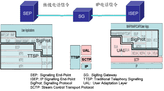 電話網(wǎng)中的一個信令節(jié)點與IP網(wǎng)中的一個信令節(jié)點不能直接相連,它們之間的相互通信需要依靠一個叫做信令網(wǎng)關(Signaling Gateway,SG)的中間設備來進行。從IP網(wǎng)絡的角度來看,這個信令網(wǎng)關有時也叫做應用服務器通信設備,因為在UAL中常把上述的IP信令節(jié)點叫做應用服務器(Application