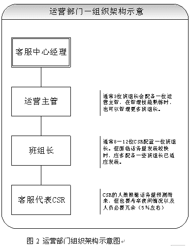 關(guān)于團(tuán)隊(duì)的建設(shè),應(yīng)該首先考慮組織架構(gòu)的設(shè)立。從運(yùn)營角度講,設(shè)置客服中心經(jīng)理、運(yùn)營主管、班組長、客服代表都是必須的。當(dāng)然根據(jù)不同的規(guī)模,也可以增加或者減少層級(jí)。具體建議請見圖2所示。除了運(yùn)營之外,對于大型呼叫中心(50坐席以上,或者業(yè)務(wù)較為復(fù)雜的),也應(yīng)考慮相關(guān)部門的設(shè)立。比如客戶關(guān)注組,可以負(fù)責(zé)疑難問題解決、工單流轉(zhuǎn)、投訴處理、建議處理、知識(shí)庫建設(shè)采編等等;培訓(xùn)組可以負(fù)責(zé)管理、組織、實(shí)施員工培訓(xùn);技術(shù)維護(hù)組可以負(fù)責(zé)系統(tǒng)維護(hù)、網(wǎng)絡(luò)維護(hù)、新項(xiàng)目應(yīng)用界面開發(fā)、部分系統(tǒng)優(yōu)化;綜合行政可以負(fù)責(zé)人事、行政等事務(wù)。