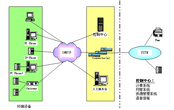 控制中心:包括資源管理系統(tǒng)、計(jì)費(fèi)系統(tǒng)、網(wǎng)管系統(tǒng)、語音信箱。 其中,資源管理系統(tǒng)主要執(zhí)行地址翻譯、權(quán)限控制、路由管理等功能;計(jì)費(fèi)系統(tǒng)主要完成計(jì)費(fèi)及結(jié)算功能;網(wǎng)管系統(tǒng)完成對(duì)網(wǎng)絡(luò)及IP PBX運(yùn)行的維護(hù)管理