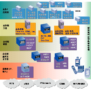 阿爾卡特朗訊會話管理實現(xiàn)IMS的P-CSCF、I/S-CSCF和BGCF的功能,網(wǎng)關(guān)控制包括MGCF和IBCF。會話管理支持2G/3G的GGSN、CAMD的PDSN、WLAN的PDG、固定有/無線的ABG的接入和會話處理。網(wǎng)關(guān)控制MGCF負(fù)責(zé)與傳統(tǒng)交換網(wǎng)絡(luò)PSTN和PLMN的互通,IBCF負(fù)責(zé)與VoIP網(wǎng)絡(luò)、IMS網(wǎng)絡(luò)和其他基于IP的多媒體網(wǎng)絡(luò)互通。接入網(wǎng)關(guān)控制實現(xiàn)電話仿真系統(tǒng)的功能。它控制A-MGW接入傳統(tǒng)固定終端,通過IMS的電話業(yè)務(wù)服務(wù)器提供各類電話基本業(yè)務(wù)和補充業(yè)務(wù)。