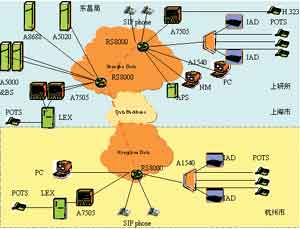 杭州秋濤局配置的是A7505中繼網(wǎng)關(guān)、A1540接入網(wǎng)關(guān)以及其他的綜合接入設(shè)備、SIP終端、H.323終端等。A7505同當(dāng)?shù)亟粨Q機(jī)配合可以經(jīng)由IP骨干網(wǎng)實(shí)現(xiàn)上海到杭州的長(zhǎng)途語音業(yè)務(wù)。A1540及經(jīng)由它的ST700可以實(shí)現(xiàn)NGN的語音數(shù)據(jù)業(yè)務(wù)。杭州到上海的連接是通過中國電信的IP骨干網(wǎng)實(shí)現(xiàn)的。