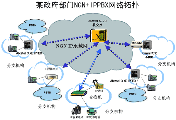上海貝爾阿爾卡特提出的用NGN整合IP PBX的解決方案,在政府、郵政、酒店、跨國企業(yè)等領(lǐng)域得到了很多成功的應用,下面以國家政府某部門的部署方案為例來詳細介紹NGN+IP
