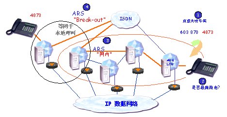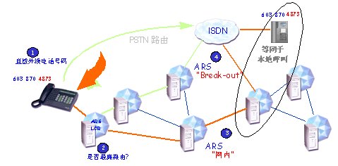 如果,一個網(wǎng)絡(luò)用戶想與一個外線用戶通話。ARS應(yīng)用程序分析所撥號碼。根據(jù)不同的呼叫方向,選擇最廉費(fèi)用的運(yùn)營商,而不管網(wǎng)絡(luò)內(nèi)的物理連接。地址信息將會被修改,從而符合該運(yùn)營商的編號計(jì)劃(增加,刪除或轉(zhuǎn)換數(shù)字),并且被叫號碼和轉(zhuǎn)換后的號碼將會被存貯在呼叫詳細(xì)記錄(CDR)內(nèi)。