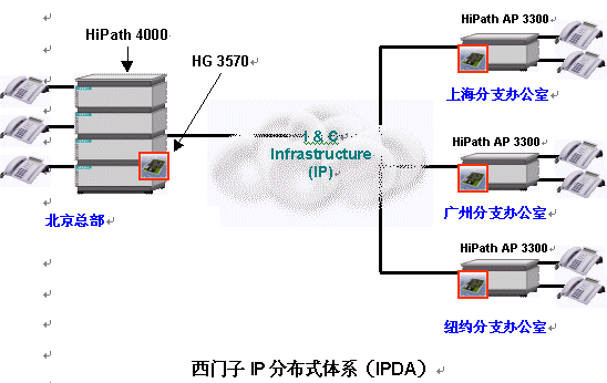 IP分布式體系(IPDA)建于西門(mén)子HiPath通信平臺(tái)之上,它能解決您的上述煩惱。在各分支辦公室部署HiPath接入點(diǎn)(Access Point)后,同時(shí)在集成IP網(wǎng)關(guān)HiPath HG 3500家族的幫助下,HiPath能夠建立起一個(gè)將所有分支辦公室包括在內(nèi)的IP通信網(wǎng)絡(luò)。