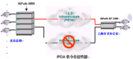 人們也許會(huì)問(wèn),IP語(yǔ)音(VoIP)是否足夠可靠?如果IP網(wǎng)絡(luò)上的信令通道出現(xiàn)故障,HiPath平臺(tái)仍將保證對(duì)各接入點(diǎn)的控制,從而提供了可靠的信令存活性能(Signaling Survivability)。在下面的圖例中,當(dāng)企業(yè)IP網(wǎng)絡(luò)出現(xiàn)某些問(wèn)題后,信令通道轉(zhuǎn)移到了公共交換電話網(wǎng)絡(luò)(PSTN)之上。