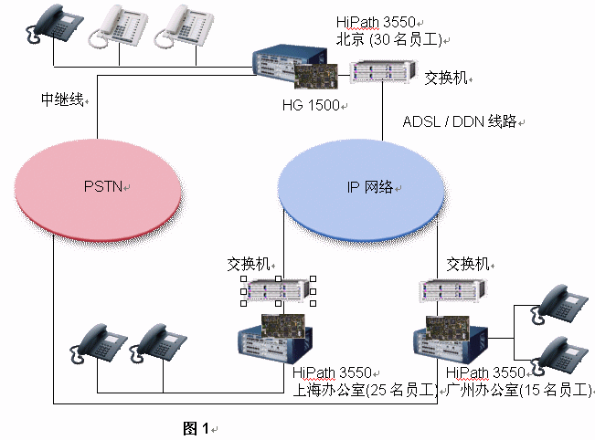 西門(mén)子推薦該公司每一個(gè)辦公室均采用HiPath 3550 PBX。如果,A公司每個(gè)辦公室已經(jīng)擁有DDN專線或ADSL連接至Internet,它就能將其內(nèi)部通信建設(shè)在現(xiàn)存的IP網(wǎng)絡(luò)的基礎(chǔ)之上。其集成網(wǎng)關(guān)HiPath 1500被用來(lái)連接數(shù)據(jù)網(wǎng)絡(luò)和語(yǔ)音網(wǎng)絡(luò)。在這樣的網(wǎng)絡(luò)架構(gòu)中,路由冗余能夠得到充足的保證,因?yàn)槲鏖T(mén)子HiPath解決方案提供了最大的網(wǎng)絡(luò)存活性:即使IP網(wǎng)絡(luò)出現(xiàn)故障,西門(mén)子網(wǎng)絡(luò)設(shè)置能夠?qū)⒙酚勺詣?dòng)切換至PSTN之上。