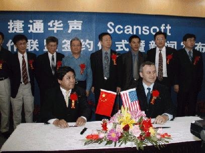 2004年5月20日,北京捷通華聲語音技術(shù)有限公司與美國(guó)Scansoft公司(Nasdaq:SSFT)宣布就語音技術(shù)全面合作達(dá)成戰(zhàn)略聯(lián)盟,雙方在北京正式簽署了合作協(xié)議,并舉行了新聞發(fā)布會(huì)。