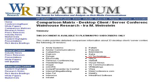 日前,在美國多媒體視頻和通訊領(lǐng)域權(quán)威市場調(diào)研機(jī)構(gòu)的 Wainhouse Research 最新發(fā)布了的全球軟件視頻會議廠商的研究報告,北京威速(V2)科技有限公司作為中國領(lǐng)先的軟件視頻會議與解決方案提供商,憑借在軟件視頻會議領(lǐng)域里始終如一的卓越表現(xiàn),以中國唯一廠商的身份入主“全球軟件視頻會議TOP30”榜單。
