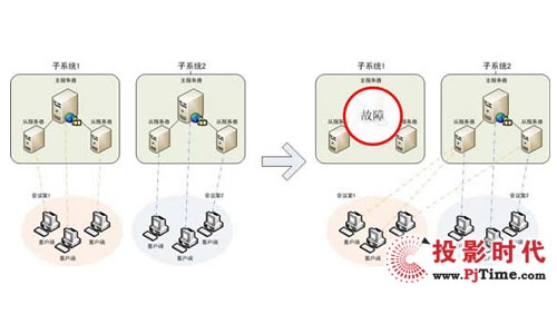 當一個子系統(tǒng)出現故障時,系統(tǒng)可以自動將故障子系統(tǒng)上的會議遷移到其他子系統(tǒng)上,做到子系統(tǒng)互為備份,極大提高了系統(tǒng)的運行支撐能力。