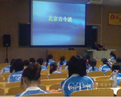 7月25日中央財(cái)經(jīng)大學(xué)的課堂里,近百位奧運(yùn)觀眾呼叫中心的志愿者聆聽(tīng)了北京第二外國(guó)語(yǔ)大學(xué)西班牙語(yǔ)呂龍根教授的講座——“北京古今談”。呂教授幽默的語(yǔ)言、澎湃的激情,感染并征服了在座的每一位志愿者。教授從中國(guó)古代的六大古都(北京、西安、洛陽(yáng)、開(kāi)封、南京、杭州)談到古代北京的五朝建都(遼、金、元、明、清),從北京偉大的中軸線,談到北京建筑的風(fēng)水學(xué),從北京的胡同和四合院,談到北京的著名小吃,等等等等?芍^是古今暢想、無(wú)所不談,真正讓我們領(lǐng)略了何為學(xué)者風(fēng)范。