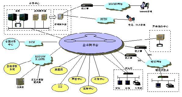 計費中心聯機采集交換機的計費數據,以及其它業(yè)務的計費數據。城區(qū)的交換機就近連入企業(yè)網,采用E1/DDN/X.25等各種聯網方式。各縣交換機的計費數據可先匯總到縣計費中心,然后再通過“九七”網絡傳到計費中心。