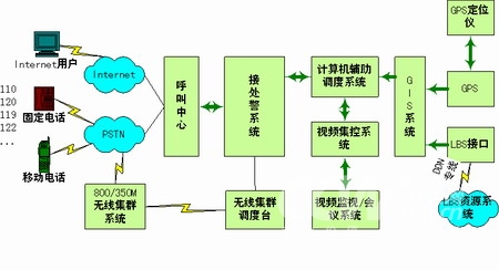 本系統(tǒng)實現(xiàn)接警、處警功能。接警中心統(tǒng)一接聽和處理市民的報警、求助電話,市民可以通過電話撥打110、119、120、122等緊急特服號碼或只撥打統(tǒng)一的特服號碼(或通過Internet方式)向系統(tǒng)求助;處警中心接收接警中心轉發(fā)的警情數據,并借助地理信息系統(tǒng)的定位、空間分析功能,對所有的資源和警力通過一體化的數據傳輸和通訊調度臺進行方便的統(tǒng)一管理、指揮和調度。