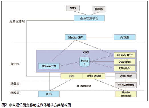 中興通訊的固定移動流媒體解決方案,是在充分比較兩網(wǎng)的異同點之后,構架的全新方案,其組網(wǎng)架構如圖2所示。