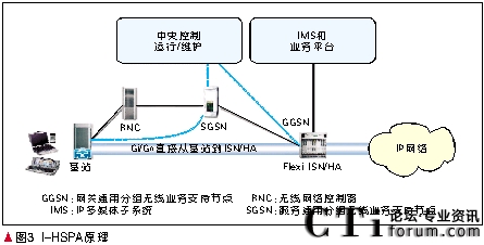 Mb/s為例,一個(gè)1 500個(gè)扇區(qū)的HSDPA網(wǎng)絡(luò)所產(chǎn)生的數(shù)據(jù)量為21.6 Gb/s。目前業(yè)界RNC的數(shù)據(jù)吞吐量僅達(dá)到1 Gb/s。今天各運(yùn)營商建設(shè)的3G網(wǎng)絡(luò)與2G共用核心網(wǎng),其帶寬和數(shù)據(jù)處理能力遠(yuǎn)遠(yuǎn)不能滿足HSPA高數(shù)據(jù)率的需求。當(dāng)數(shù)據(jù)負(fù)荷激增時(shí)運(yùn)營商將面對RNC/SGSN的擴(kuò)容的巨大壓力。此外在每一個(gè)節(jié)點(diǎn)處對數(shù)據(jù)包的重新拆裝會(huì)導(dǎo)致在每一節(jié)點(diǎn)都要引入額外的時(shí)延。結(jié)果會(huì)產(chǎn)生較長的網(wǎng)絡(luò)時(shí)延。對于移動(dòng)互聯(lián)網(wǎng)應(yīng)用,這種多層次的網(wǎng)絡(luò)結(jié)構(gòu)是沒有必要的。使網(wǎng)絡(luò)扁平化不僅可以簡化設(shè)備降低成本,還可以減少時(shí)延。I-HSPA應(yīng)運(yùn)而生。這種架構(gòu)把基站通過Gi/Gn口直接連接到GGSN節(jié)點(diǎn)(通向互聯(lián)網(wǎng)和數(shù)據(jù)業(yè)務(wù)的網(wǎng)關(guān))[5]。I-HSPA原理如圖3所示。