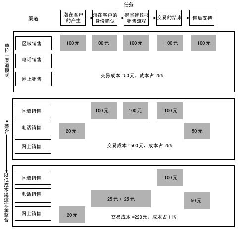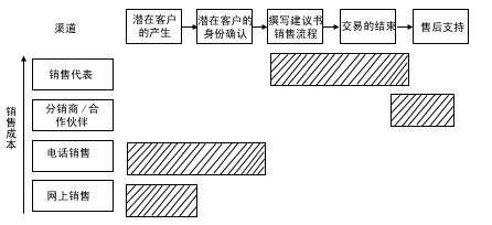 渠道整合強(qiáng)調(diào)在一個(gè)銷售過(guò)程中分工的不同給企業(yè)帶來(lái)更多的利潤(rùn),將銷售過(guò)程的任務(wù)一一分配給不同成本的渠道來(lái)完成。銷售過(guò)程的中間環(huán)節(jié)——面對(duì)面的銷售和交易的達(dá)成,通常需要由成本較高的區(qū)域銷售代表和分銷伙伴來(lái)完成,客戶的產(chǎn)生及身份的確認(rèn)和售后服務(wù)環(huán)節(jié)通常由低成本渠道完成,F(xiàn)在,我們對(duì)照?qǐng)D4來(lái)比較一下: