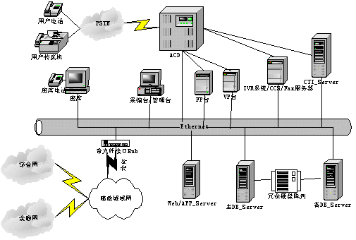 呼叫中心的功能主要有兩方面,一是與用戶進行交互,另外與金融主機房進行數據交互。呼叫中心系統(tǒng)由兩部分組成:聲訊平臺(CALL CENTER)和業(yè)務數據計算機網絡平臺。聲訊平臺由話務接入設備(ACD)、IVR系統(tǒng)和CTI服務器組成,主要負責語音資源的管理、呼入話務的排隊、自動業(yè)務以及人工座席的管理等;業(yè)務數據計算機網絡平臺是對業(yè)務數據的收集、使用、管理、分析等。平臺間通過CTI技術實現(xiàn)數字數據和語音數據的相互轉換和同步轉移。系統(tǒng)結構如下。