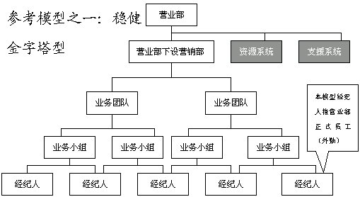 此五種模式建立在營業(yè)部基礎(chǔ)上,在券商總部,建議設(shè)立垂直的業(yè)務(wù)管理機(jī)構(gòu),即經(jīng)紀(jì)業(yè)務(wù)總部實(shí)行事業(yè)部制,下設(shè)分工專業(yè)的市場營銷部、客戶服務(wù)部、經(jīng)紀(jì)人訓(xùn)練部和綜合管理部等。