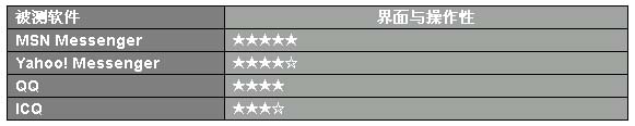 對(duì)于IM類軟件來說,網(wǎng)友希望其界面在精美的同時(shí)越簡單越直接越好。在這一點(diǎn)上,MSN Messenger最為突出,界面精致,操作極易上手,在本次評(píng)測中獲得一致認(rèn)可,位列第一;Yahoo! Messenger操作上也比較直觀,只是“做工”顯得有些粗糙;被測的QQ2003剛剛在界面上做了重大的改變,只是稍顯零亂,對(duì)MSN的部分借鑒比較成功,對(duì)于一個(gè)新用戶來說最基本的功能的使用還算方便;ICQ功能的確強(qiáng)大,界面有些老舊,(ICQ Lite可以改變這一切,但是ICQ Lite僅僅是ICQ的一個(gè)插件版本,本次評(píng)測沒有考慮),ICQ操作對(duì)中文用戶來說也過于繁復(fù)。
