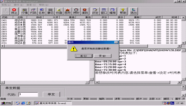 行情也可以單發(fā),只要在進(jìn)行證券信息發(fā)布時(shí)在程序主界面的下方<單發(fā)數(shù)據(jù)>區(qū)輸入要單發(fā)的股票代碼,然后點(diǎn)擊<單發(fā)>按鈕,系統(tǒng)就會(huì)盡快刷新該只股票。