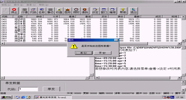 選擇該功能,系統(tǒng)會(huì)自動(dòng)發(fā)送所有指數(shù)和股票的歷史圖形。歷史圖形發(fā)送用時(shí)較長(zhǎng),一般要用一個(gè)小時(shí)左右,它中間的延時(shí)要由信息發(fā)布時(shí)間間隔來定,信息發(fā)布時(shí)間間隔越大,耗時(shí)越長(zhǎng)。