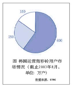彩鈴業(yè)務(wù)最先是由韓國的SK電信于2002年3月推出的,業(yè)務(wù)一經(jīng)面世就吸引了移動(dòng)用戶、特別是年青用戶群體的眼球,開通的用戶數(shù)和業(yè)務(wù)使用率呈指數(shù)式增長(zhǎng);同時(shí)由彩鈴業(yè)務(wù)帶來的互聯(lián)網(wǎng)、WAP和IVR的話務(wù)量的增長(zhǎng)進(jìn)一步提升了彩鈴業(yè)務(wù)的含金量。隨后韓國的其他兩個(gè)移動(dòng)運(yùn)營商LG電信和韓國電信也分別于2002年6月和9月相繼開通彩鈴業(yè)務(wù)。經(jīng)過運(yùn)營商和彩鈴的內(nèi)容提供商的前期市場(chǎng)推廣和運(yùn)作,目前已發(fā)展了近1000萬用戶,其中運(yùn)營商的市場(chǎng)份額如圖所示。