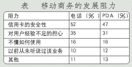 手機支付業(yè)務的進一步發(fā)展主要受制于用戶對該項業(yè)務的接受程度。Forrester研究公司的研究表明,超過一半的被訪者認為信用卡的安全性是移動商務發(fā)展的主要阻力。(調查結果見下表)