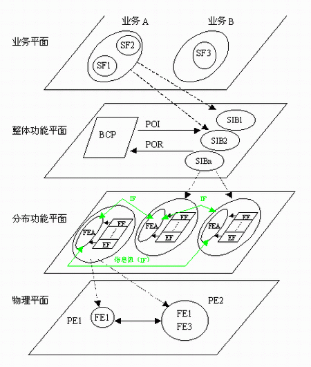 在上圖1中, SF—業(yè)務屬性;BCP—基本呼叫處理;SIB—業(yè)務無關構筑塊;FE—功能實體; FEA—功能實體動作;FE—物理實體;POI—起始點;