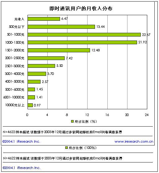 從收入情況來看,即時通訊用戶仍然以低收入為主,其中月收入低于1500元的用戶比例高達64.5%,這可能與使用即時通訊的用戶主要是學(xué)生和普通公司職員的緣故。